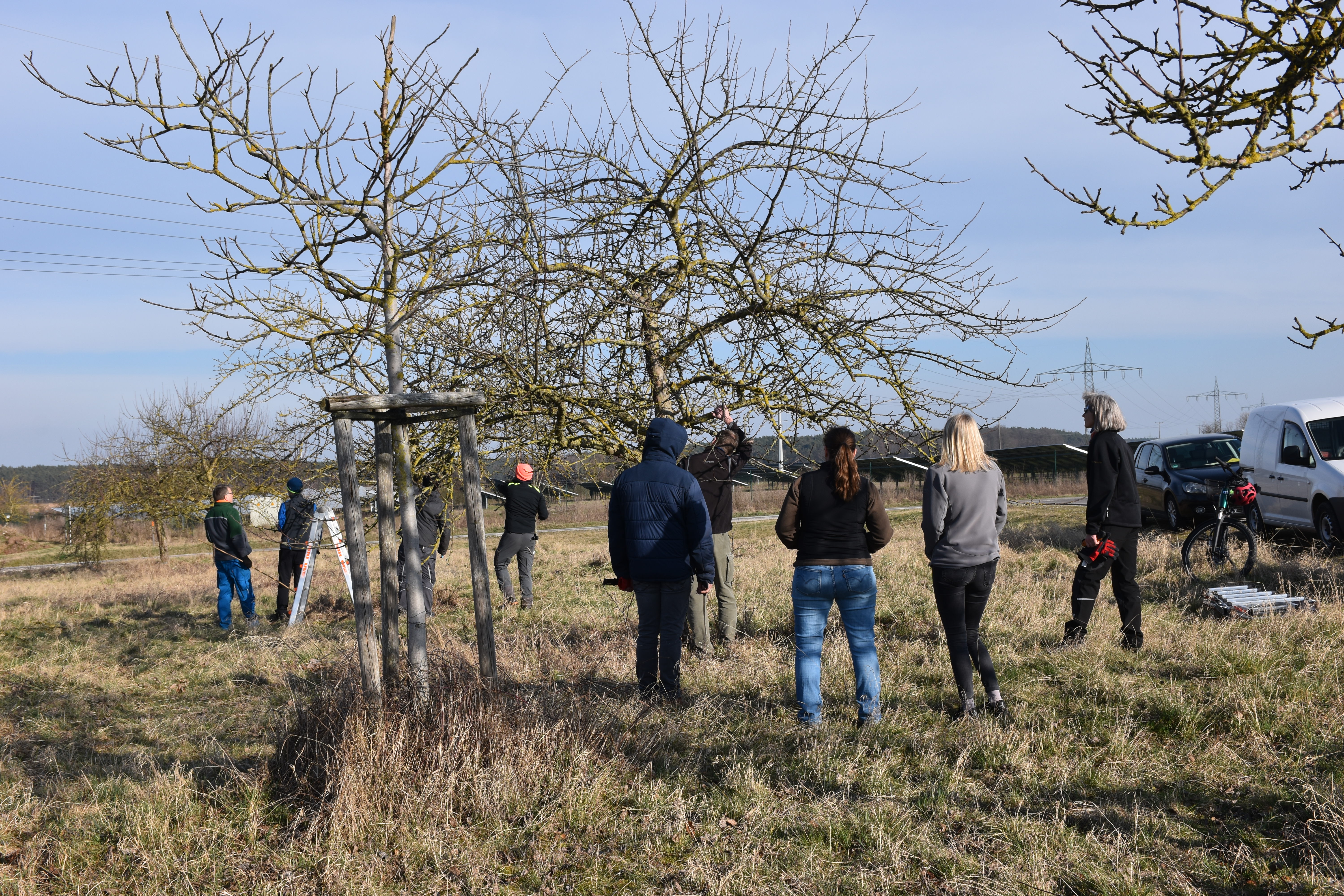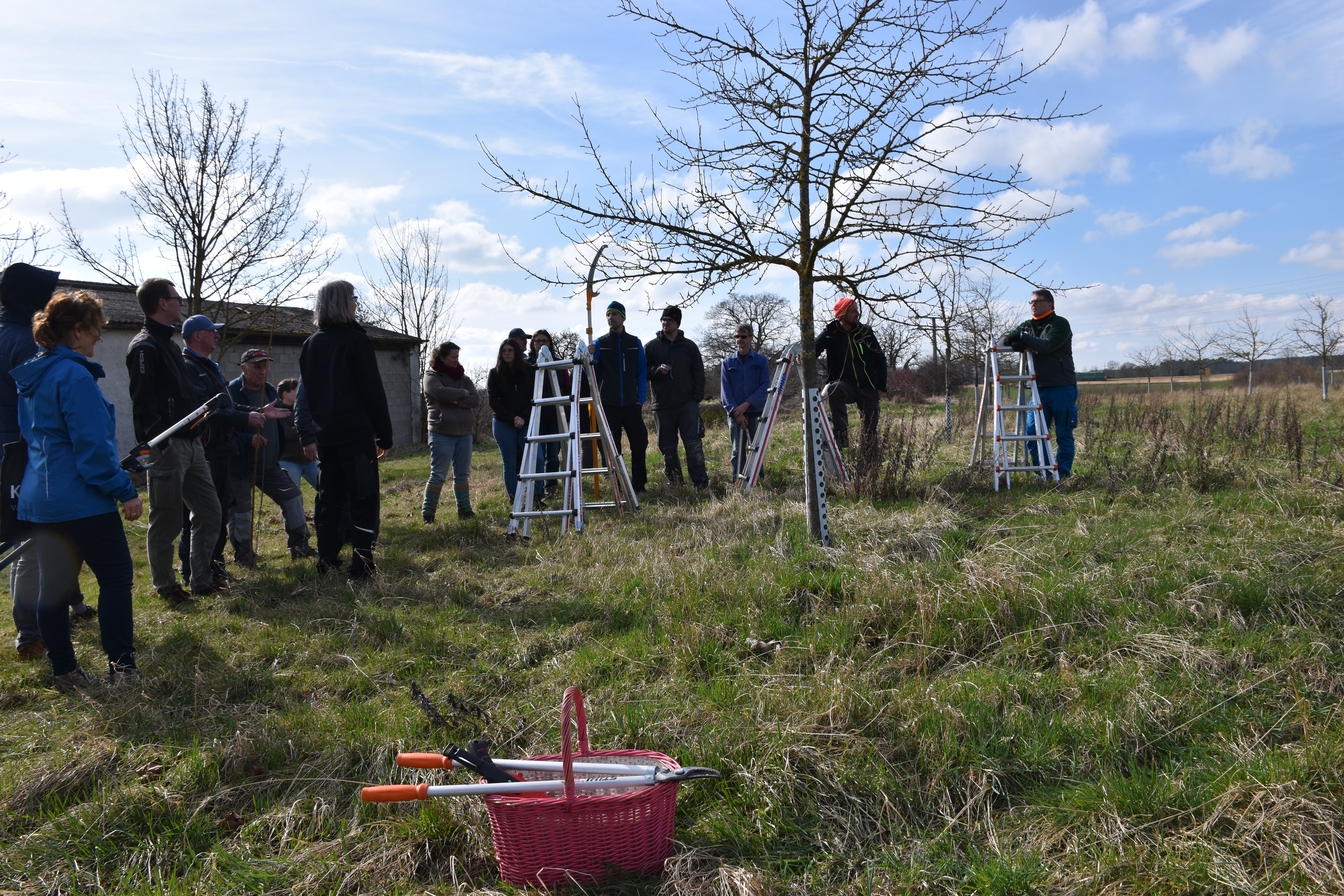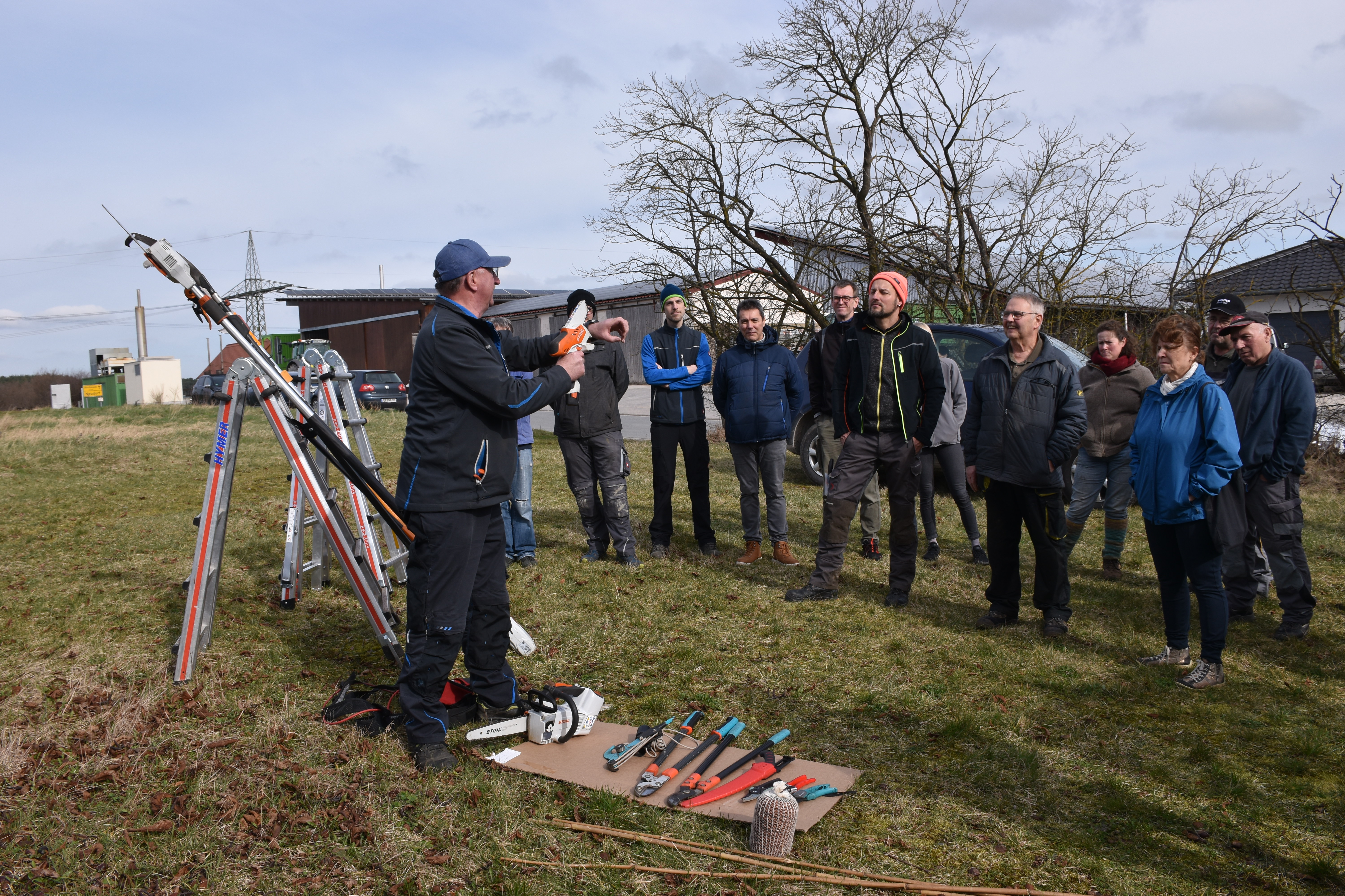 Bei sonnigem Vorfrühlingswetter konnte der Obst- und Gartenbauverein Dietenhofen 20 Teilnehmer beim diesjährigen Baumschnittkurs begrüßen. Der Kurs, der von den drei ausgebildeten Baumwarten Joachim Graf, Günther Volland und Barbara Lehmeyer gehalten wurde, war bewusst für Männer und Frauen ausgeschrieben. Erfahrungsgemäß hatten sich in den letzten Jahren meist nur Männer zum Baumschneiden angemeldet. Und tatsächlich konnte der Verein dieses Jahr auch einige Frauen begrüßen. Los ging es dann erst mal mit der Theorie. Es wurde gezeigt, welches Werkzeug man zum Baumschneiden benötigt, die Teilnehmer erfuhren, dass man Bäume regelmäßig schneiden sollte, damit das Obst zum Reifen genügend Licht und Sonne bekommt und das die Qualität erhalten bleibt. Man kann im Winter wenn es frostfrei ist, jederzeit Bäume schneiden, dies fördert das Wachstum. Ein Sommerschnitt im Juli dagegen bremst das Wachstum des Baumes. Anhand von mitgebrachten Ästen demonstrierten die Baumwarte den Pflanzschnitt, es wurde aber auch der Ertrags- bzw. der Verjüngungsschnitt erklärt. In einem Obstgarten mit ca. 10 bis 12jährigen Apfelbäumen konnten dann die Teilnehmer In kleinen Gruppen unter Anleitung der Baumwarte gleich umsetzen was sie zuvor gelernt hatten. Sie durften dabei auch das zuvor gezeigte Werkzeug z.B. einen Akku-Hochentaster oder eine Schneidgiraffe ausprobieren.