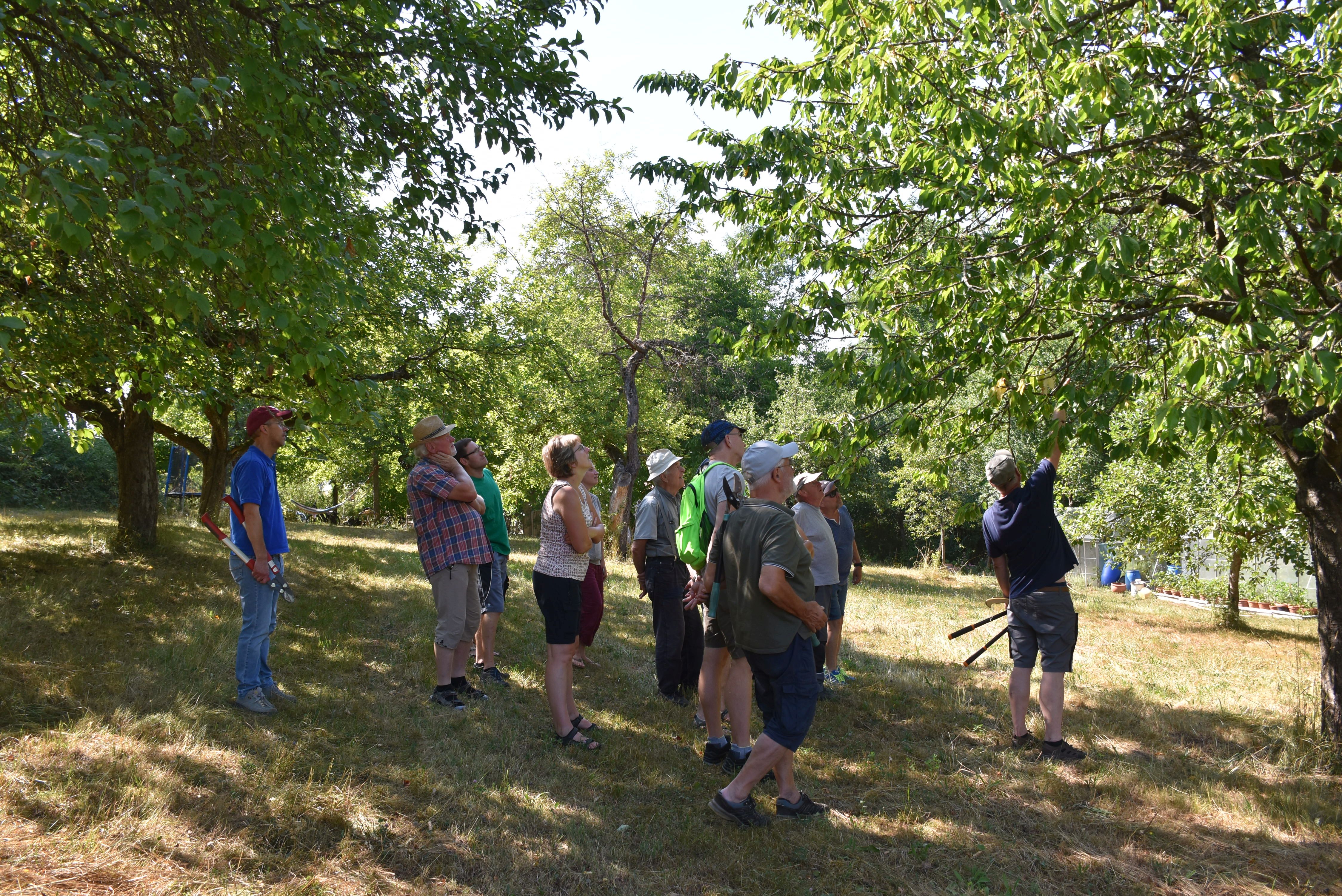 Ende Juli fand im wunderschönen Garten der Mühle in Andorf ein Sommerschnittkurs für Obstbäume und Beerensträucher statt. Kreisfachberater Volkmar Then erklärte am Anfang anschaulich an dem mitgebrachten Astscheren, Teleskopscheren und Sägen welche man am besten wozu verwendet. Er erläuterte dann zuerst theoretisch wie man Obstbäume und Beerensträucher im Sommer schneidet, wie man den sogenannten Sommerriss macht, das heißt, die Wasserschosse werden mit einer Drehbewegung ausgerissen und nicht abgeschnitten. Außerdem erklärte er den Unterschied zwischen Sommer- und Winterschnitt. Der Sommerschnitt regt beim Baum für das nächste Jahr die Fruchtbildung an, schneidet man die Bäume dagegen im Winter regt dies mehr das Holzwachstum an. Herr Then erläuterte auch, dass man Kernobst z.B. Kirschbäume, am besten gleich zur oder nach der Ernte schneidet. Nach der Theorie ging es dann an die Praxis. An den unterschiedlich alten Bäumen konnten dann die Teilnehmer das Gelernte umsetzen. Die Teilnehmer waren mit viel Eifer dabei und am Ende war man sich einig, dass der Kurs wieder viel neues Wissen vermittelt hat oder das bekannte Wissen aufgefrischt wurde. Herrn Then haben wir gleich wieder für eine Schnittkurs im Winter eingeladen